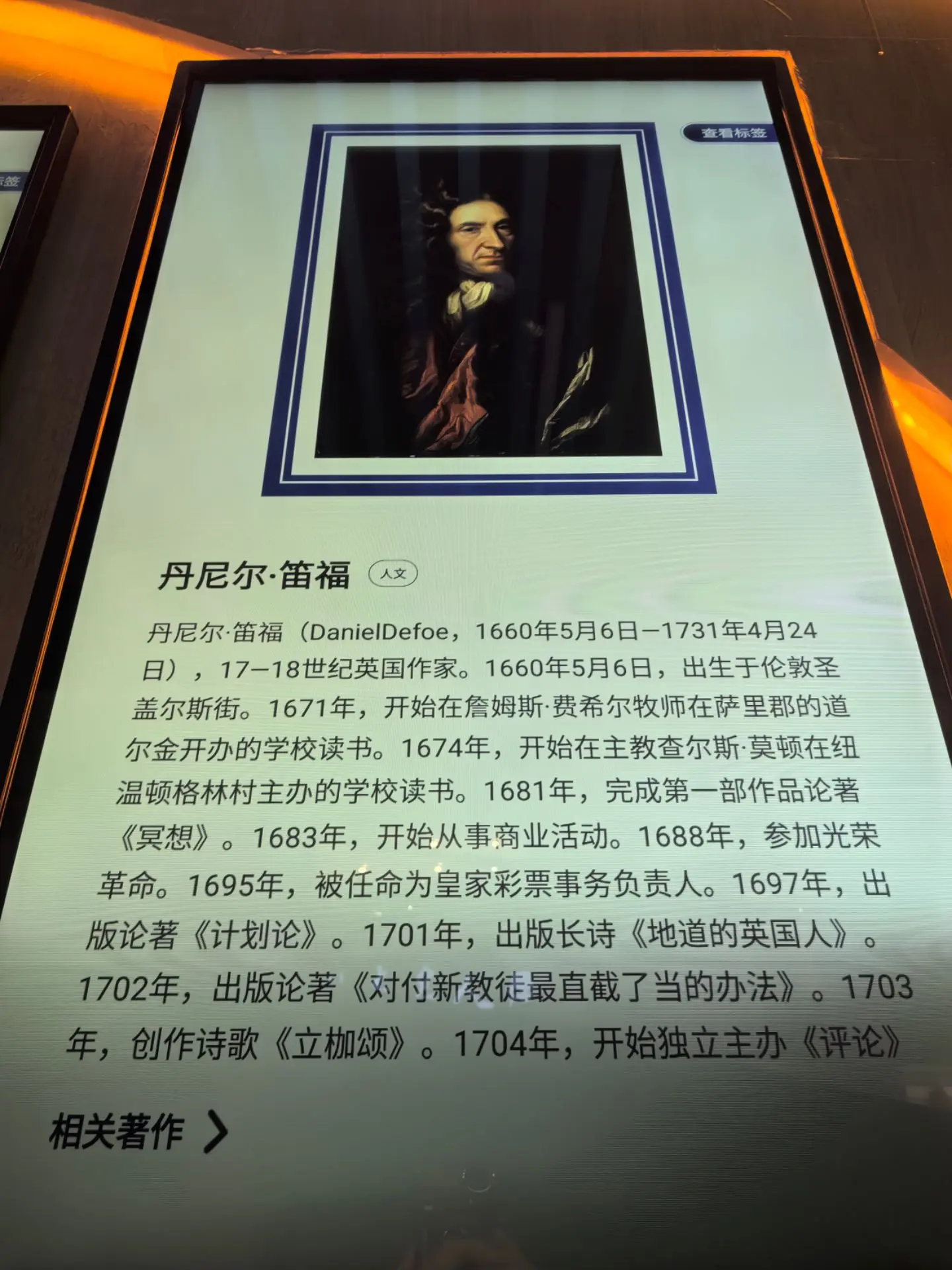 丹尼尔·笛福(Daniel Defoe,1660年5月6日—1731年4月24日),17—18世纪英国作家 1 。 1660年5月6日,出生于伦敦圣盖尔斯街。1671年,开始在詹姆斯·费希尔牧师在萨里郡的道尔金开办的学校读书。1674年,开始在主教查尔斯·莫顿在纽温顿格林村主办的学校读书。1681年,完成第一部作品论著《冥想》。1683年,开始从事商业活动。1688年,参加光荣革命。1695年,被任命为皇家彩票事务负责人。1697年,出版论著《计划论》。1701年,出版长诗《地道的英国人》。1702年,出版论著《对付新教徒最直截了当的办法》。1703年,创作诗歌《立枷颂》。1704年,开始独立主办《评论》杂志。1705年,创作行旅小说《团结》。1709年,完成历史记录《大不列颠联合王国史》。1719年,出版长篇小说《鲁滨逊漂流记》。讨论1720年,完成历史小说《骑士回忆录》《辛格顿船长》《鲁滨逊漂流记的回想》。1722年,出版小说《摩尔·弗兰德斯》《杰克上校》《大疫年日记》。1724年,出版小说《罗克萨娜》。1725年,出版小说《英国商人手册》。1731年4月24日,逝世于伦敦居所,葬于本希尔公墓人物生平 1660年5月6日,出生于伦敦圣杰鲁斯·克里布鲁教区圣盖尔斯街。1671—1674年,在詹姆斯·费希尔牧师在萨里郡的道尔金开办的学校读书 1 。 1674—1679年,在主教查尔斯·莫顿在伦敦附近的纽温顿格林村主办的学校读书,为将来当一名牧师作准备。 1681年,完成第一部作品论著《冥想》,该作品是一系列抒发个人宗教情绪的论作 1 。 1683年,开始从事商业活动,包括酒、烟草、麝猫香和针织品等贸易,并此到过国内外许多地方。1688年,积极参加光荣革命,使他所拥护的威廉三世登上王位 1 。 1692年,经商破产,不得不给政府当情报员,并设计开发事业糊口,不久从破产中恢复了过来;同年,开始发表许多讽刺性的时事论文及诗词,以支持辉格党威廉王。1695年,被任命为皇家彩票事务负责人,开始正式使用“笛福”这个名字 1 。 1697年,出版论著《计划论》,其中所提出的计划包罗万象,如开办女子学校、渔民终生福利等等。1701年,因出版长诗《地道的英国人》(又译作《货真价实的英国人》)引起关注,在这部作品中他反击那些批评威廉国王的谰言 1 。 1702年,撰写政治论著《对付新教徒最直截了当的办法》(又译作《消灭不同教派的捷径》),用反语讽刺政府的宗教歧视政策。1703年,因《对付新教徒最直截了当的办法》的发表而被捕判刑,被套上颈手枷游街示众三次,但由于托利党的一位叫罗伯特·哈利的大臣的努力而获释,开始效力于托利党,积极拥护它的政纲,担任新闻记者、顾问;同年,创作诗歌《立枷颂》,讽刺法律的不公,因此被伦敦市民奉为英雄1704—1713年,独立主办《评论》杂志,刊物上的文章几乎全部出自他一人之手;同时期,还为罗伯特·哈利搜集情报。1705年,创作幻想式行旅小说《团结》1709年,完成历史记录《大不列颠联合王国史》。1715年,因哈利被判入狱遭到牵连被判有罪,但博得辉格党的信任,成为反间谍,从事颠覆保皇党的任务;同年,出版论著《家庭指导》,该作品是一本行为指南一类的书,受到公众欢迎 1 。 1719年,出版长篇小说《鲁滨逊漂流记》,该作品讲述鲁滨逊·克鲁索只身漂流到无人的荒岛,开始了28年与世隔绝的生活的故事并凭着强韧的意志与不懈的努力生存下来,最终返回故乡的故事 1 。 1720年,完成历史小说《骑士回忆录》,该作品故事的背景设置在三十年战争与英国内战期间,兼有想象、纪实;同年,出版长篇小说《辛格顿船长》,讲述辛格顿航海冒险、开发荒岛的故事;同年,出版有关鲁滨逊的长篇小说《鲁滨逊漂流记的回想》(又译作《鲁滨逊沉思录》)1722年,出版了小说《摩尔·弗兰德斯》《杰克上校》《大疫年日记》(又译作《瘟疫年记事》),其中,《杰克上校》讲述主人公当兵、被贩卖、成为种植园主等一系列经历,《摩尔·弗兰德斯》讲述一个女囚犯的故事,《大疫年日记》是一部以1664—1666年的“伦敦大瘟疫”为背景的小说丹尼尔·笛福 18世纪英国作家 丹尼尔·笛福(Daniel Defoe,1660年5月6日—1731年4月24日),17—18世纪英国作家 1 。 1660年5月6日,出生于伦敦圣盖尔斯街。1671年,开始在詹姆斯·费希尔牧师在萨里郡的道尔金开办的学校读书。1674年,开始在主教查尔斯·莫顿在纽温顿格林村主办的学校读书。1681年,完成第一部作品论著《冥想》。1683年,开始从事商业活动。1688年,参加光荣革命。1695年,被任命为皇家彩票事务负责人。1697年,出版论著《计划论》。1701年,出版长诗《地道的英国人》。1702年,出版论著《对付新教徒最直截了当的办法》。1703年,创作诗歌《立枷颂》。1704年,开始独立主办《评论》杂志。1705年,创作行旅小说《团结》。1709年,完成历史记录《大不列颠联合王国史》。1719年,出版长篇小说《鲁滨逊漂流记》。讨论1720年,完成历史小说《骑士回忆录》《辛格顿船长》《鲁滨逊漂流记的回想》。1722年,出版小说《摩尔·弗兰德斯》《杰克上校》《大疫年日记》。1724年,出版小说《罗克萨娜》。1725年,出版小说《英国商人手册》。1731年4月24日,逝世于伦敦居所,葬于本希尔公墓 1 。 中文名 丹尼尔·笛福 外文名 Daniel Defoe 国籍 英国 出生日期 1660年5月6日 逝世日期 1731年4月24日 职业 作家 出生地 英国伦敦 代表作品 《鲁滨逊漂流记》《杰克上校》 性别 男 特色词条 本词条按照特色词条指南编辑并维护 